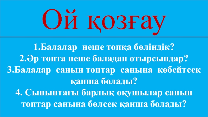 Ой қозғау1.Балалар неше топқа бөліндік?2.Әр топта неше баладан отырсындар?3.Балалар санын топтар санына көбейтсек қанша болады?4. Сыныптағы барлық