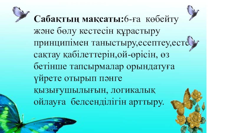 Слайд 2Сабақтың мақсаты:6-ға көбейту және бөлу кестесін құрастыру принципімен таныстыру,есептеу,есте сақтау қабілеттерін,ой-өрісін,