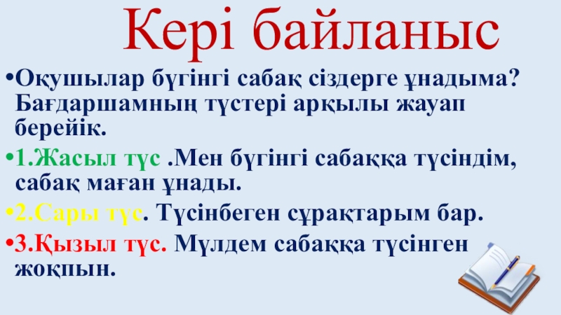 Кері байланысОқушылар бүгінгі сабақ сіздерге ұнадыма? Бағдаршамның түстері арқылы жауап берейік.1.Жасыл түс .Мен бүгінгі сабаққа түсіндім,