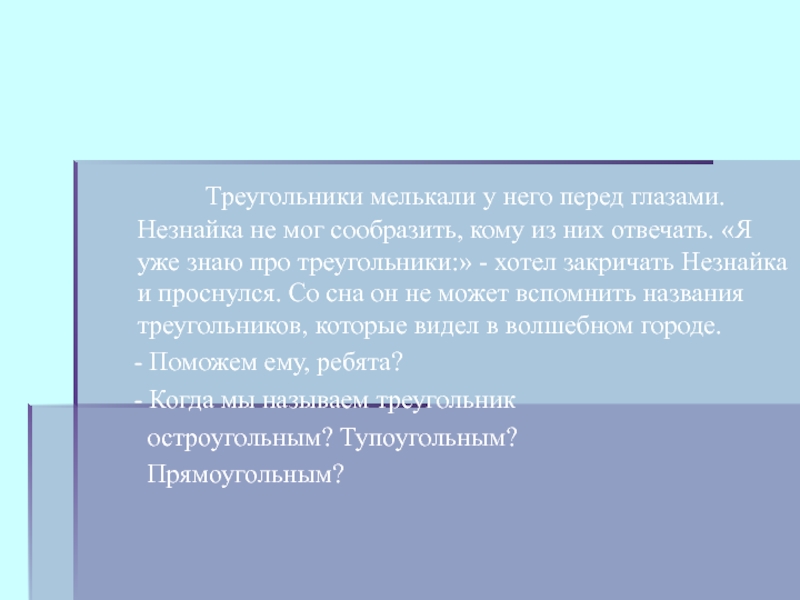 Незнайка не мог сообразить, кому из них отвечать. «Я уже знаю про треугольники:» - хотел закричать Незнайка и проснулся. Со сна он не может вспомнить названия треугольников, которые видел в волшебном городе.