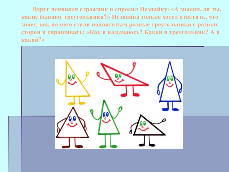 ли ты, какие бывают треугольники?» Незнайка только хотел ответить, что знает, как на него стали надвигаться разные треугольники с разных сторон и спрашивать: «Как я называюсь? Какой я треугольник? А я какой?»