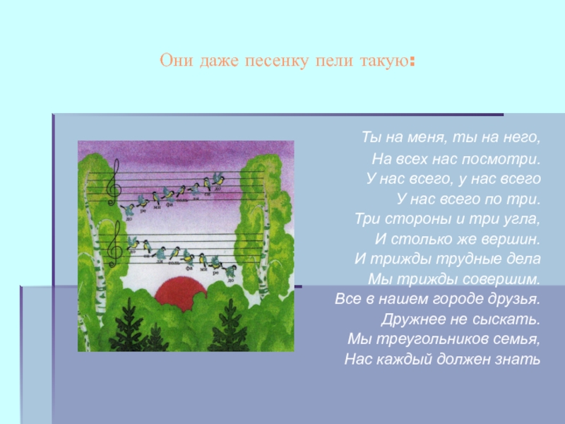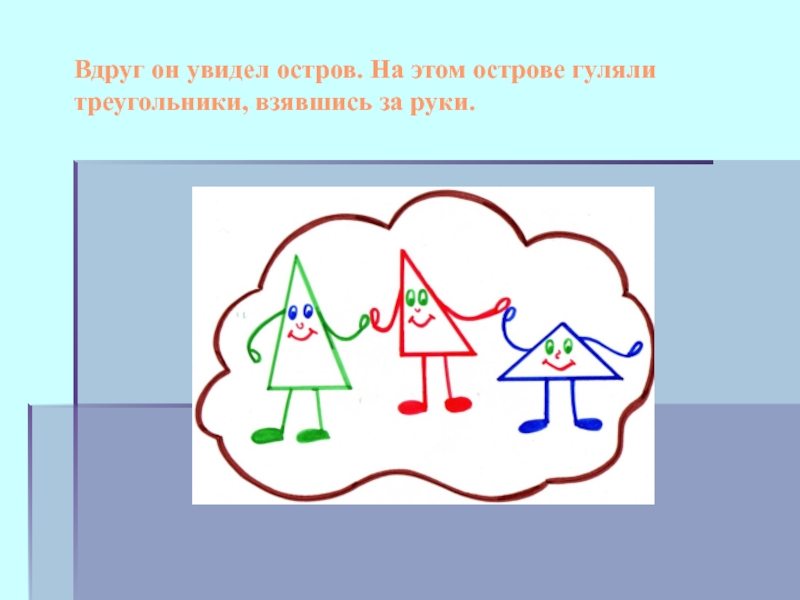 Слайд 16Вдруг он увидел остров. На этом острове гуляли треугольники, взявшись за