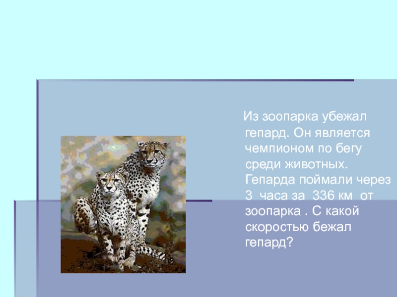 бегу среди животных. Гепарда поймали через 3 часа за 336 км от зоопарка . С какой скоростью бежал гепард?