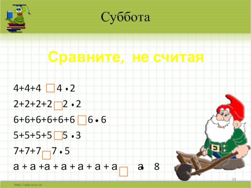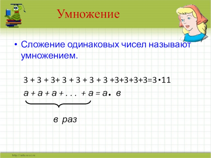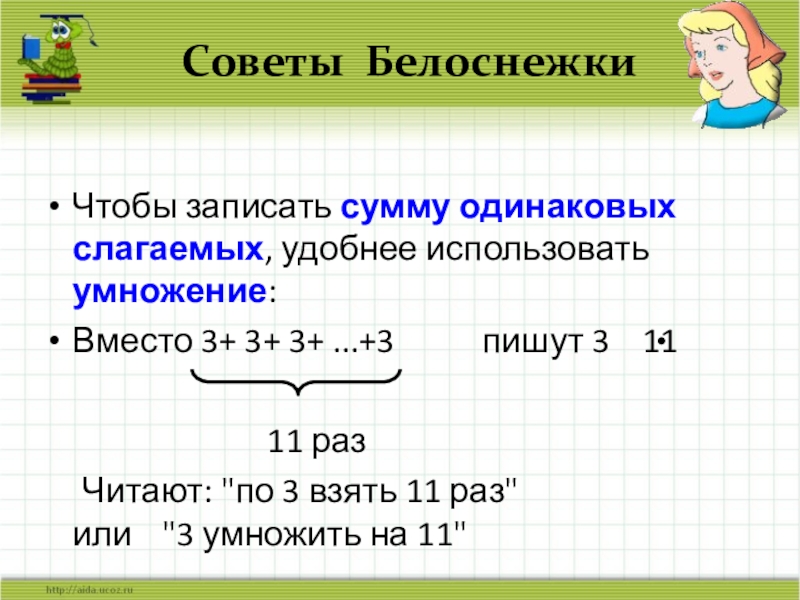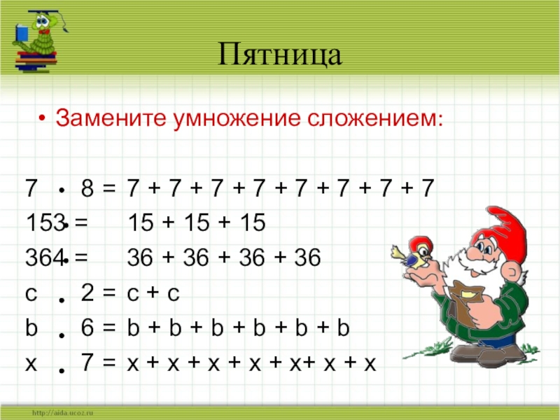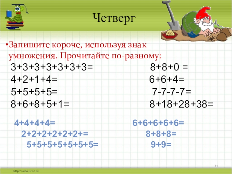 Запишите короче, используя знак умножения. Прочитайте по-разному: