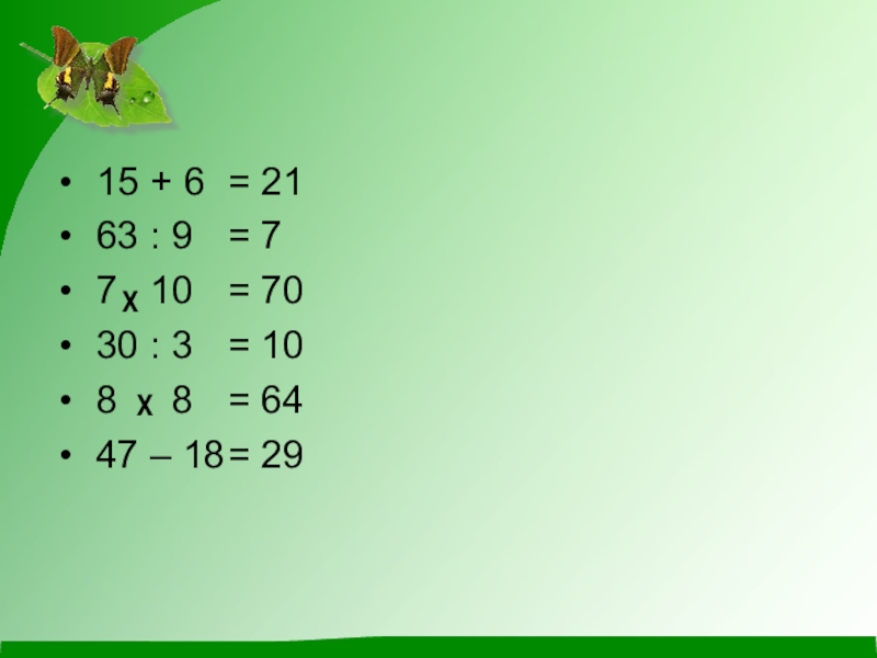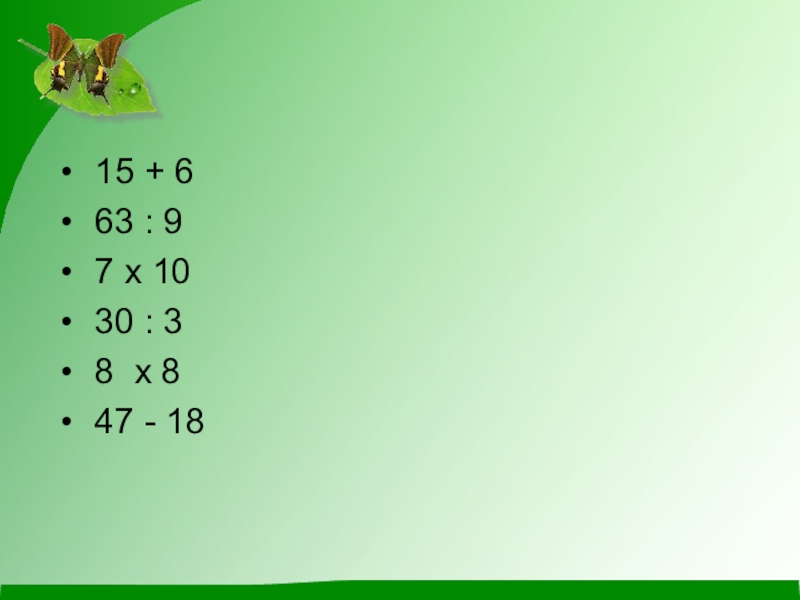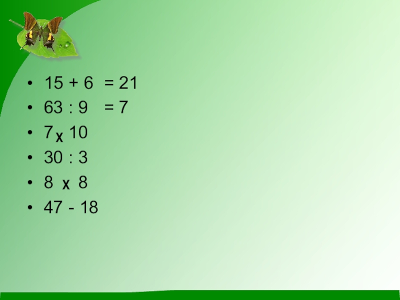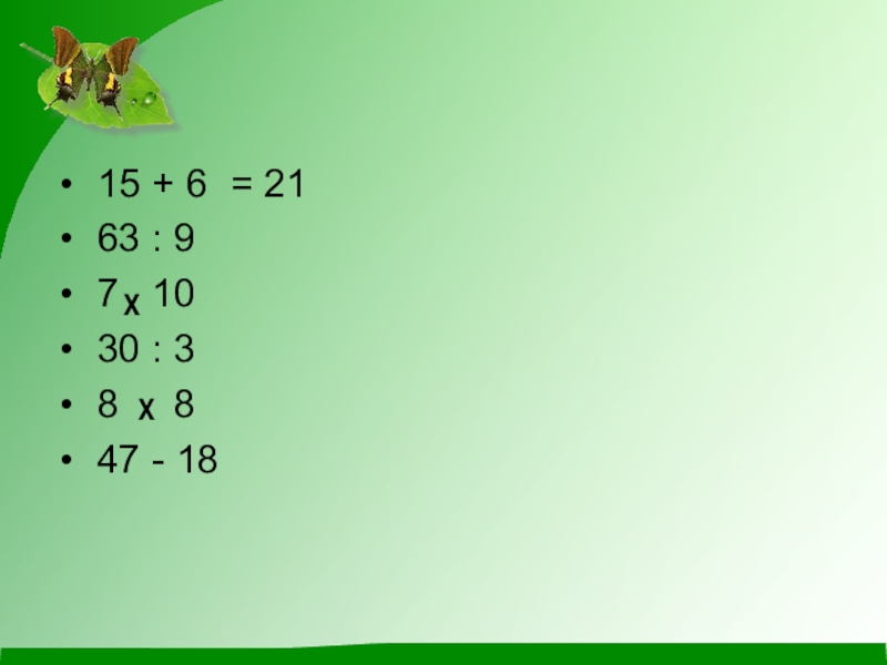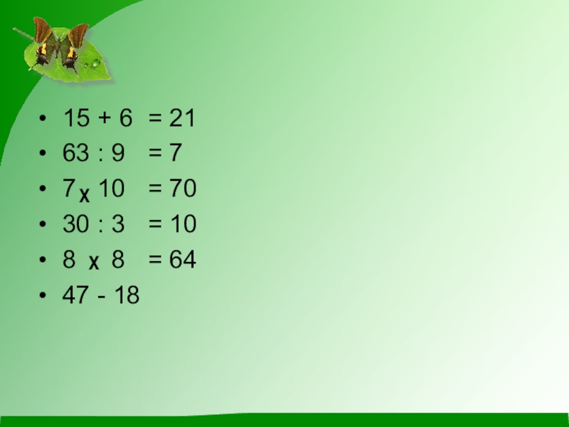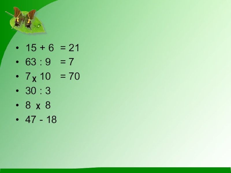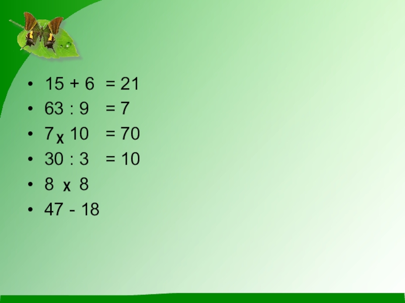 15 + 6 63 : 9 7 х 10 30 : 3 8 х 8 47