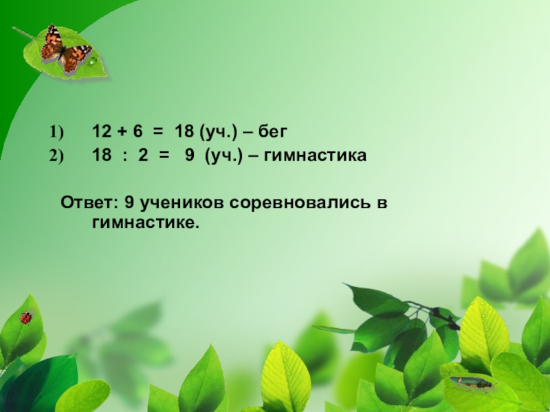 12 + 6 = 18 (уч.) – бег18 : 2 =  9 (уч.) – гимнастика Ответ:
