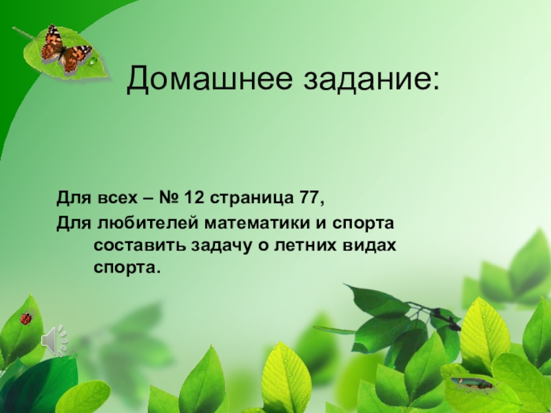 Домашнее задание:Для всех – № 12 страница 77,Для любителей математики и спорта составить задачу о летних видах