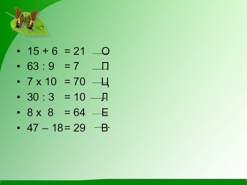 15 + 6	= 21  	О 63 : 9	= 7		П 7 х 10 	= 70		Ц 30