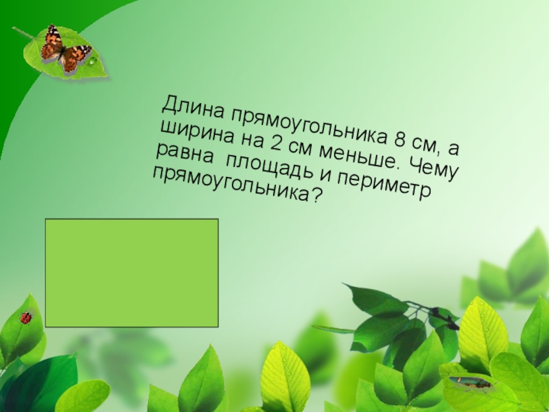 Слайд 3Длина прямоугольника 8 см, а ширина на 2 см меньше. Чему