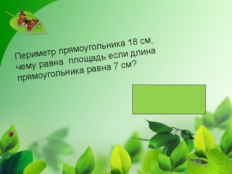 Слайд 4Периметр прямоугольника 18 см, чему равна площадь если длина прямоугольника равна