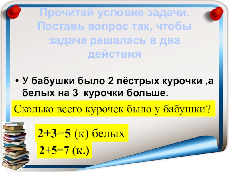 У бабушки было 2 пёстрых курочки ,а белых на 3 курочки больше.