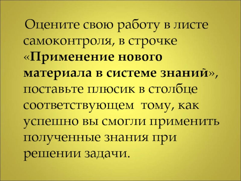 нового материала в системе знаний», поставьте плюсик в столбце соответствующем тому, как успешно вы смогли применить полученные знания при решении задачи.