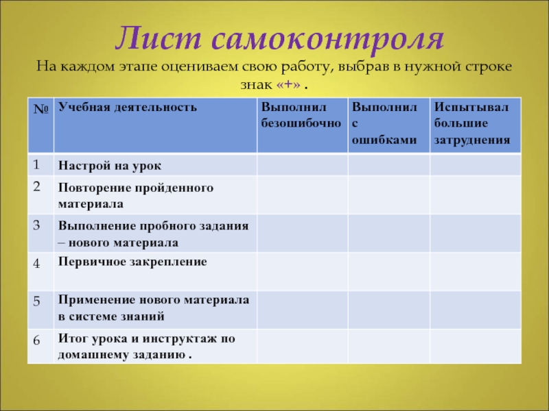 поставьте плюсик в столбце соответствующем вашим достижениям при первичном закреплении нового материала.