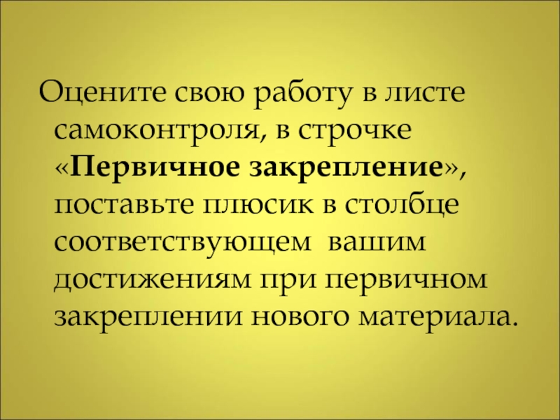 Слайд 30 Оцените свою работу в листе самоконтроля, в строчке «Первичное закрепление»,
