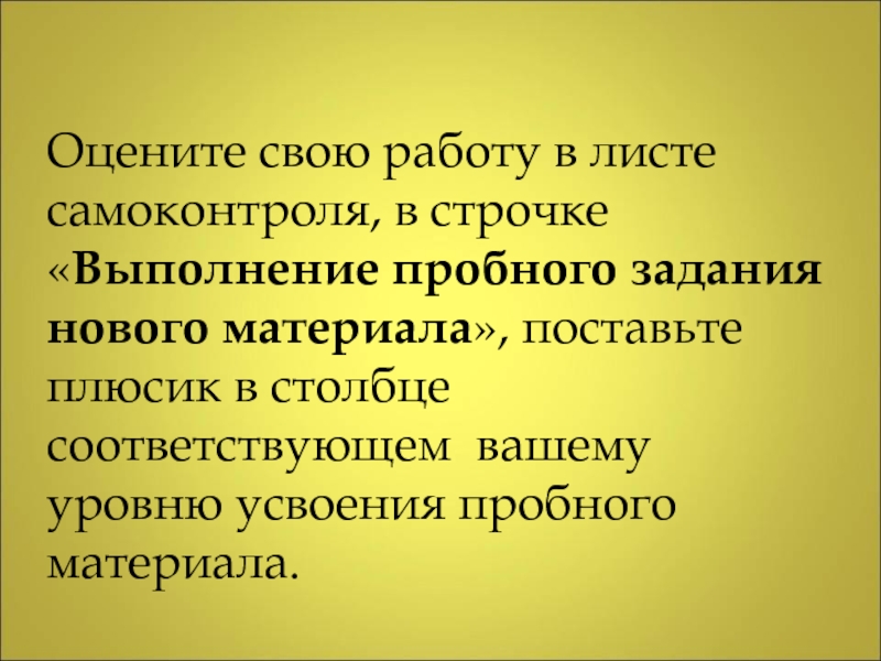 Слайд 25Оцените свою работу в листе самоконтроля, в строчке «Выполнение пробного задания
