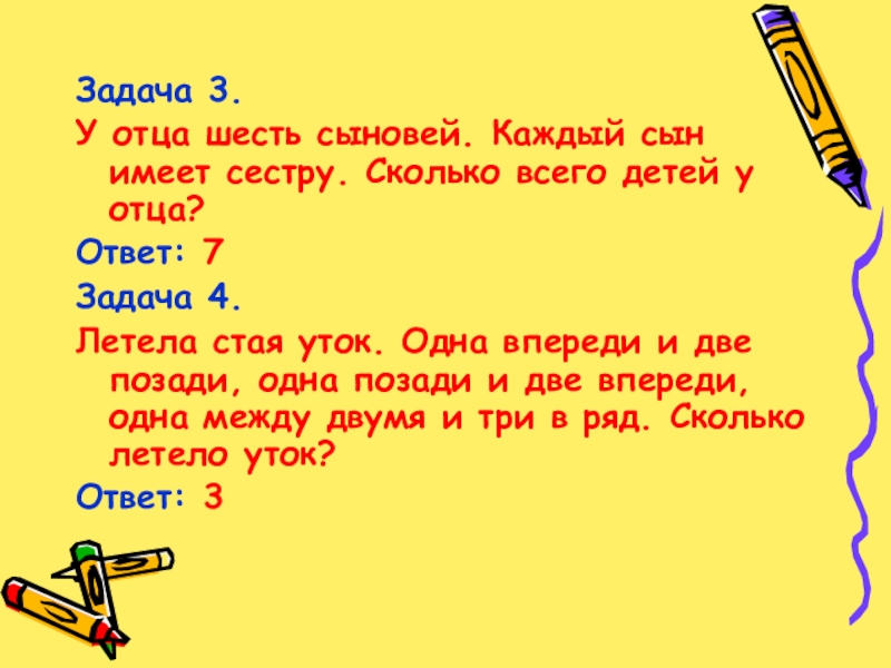 Летела стая уток. Одна впереди и две позади, одна позади и две впереди, одна между двумя и три в ряд. Сколько летело уток?
