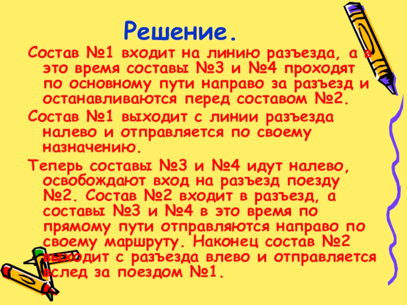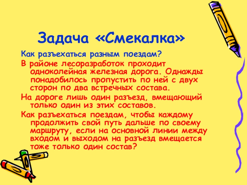 Как разъехаться поездам, чтобы каждому продолжить свой путь дальше по своему маршруту, если на основной линии между входом и выходом на разъезд вмещается тоже только один состав?