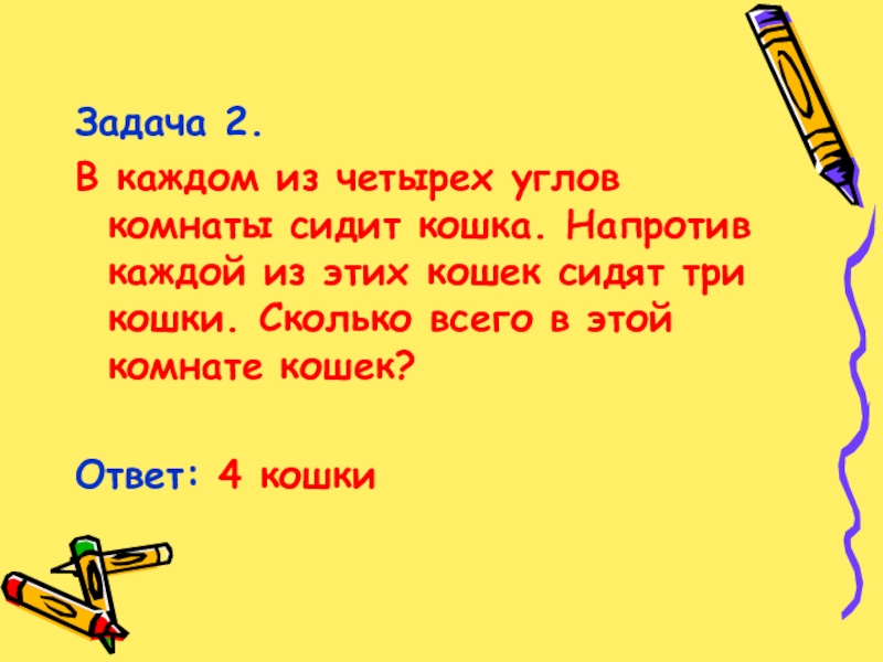 В каждом из четырех углов комнаты сидит кошка. Напротив каждой