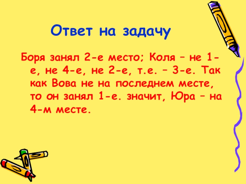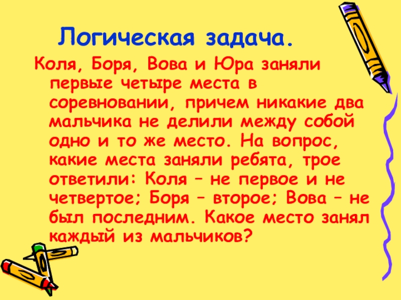 соревновании, причем никакие два мальчика не делили между собой одно и то же место. На вопрос, какие места заняли ребята, трое ответили: Коля – не первое и не четвертое; Боря – второе; Вова – не был последним. Какое место занял каждый из мальчиков?