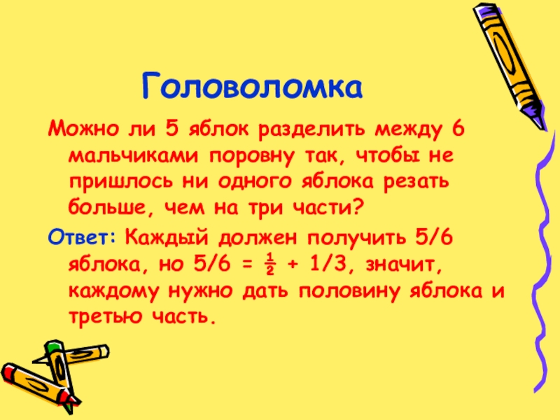 Можно ли 5 яблок разделить между 6 мальчиками поровну так, чтобы