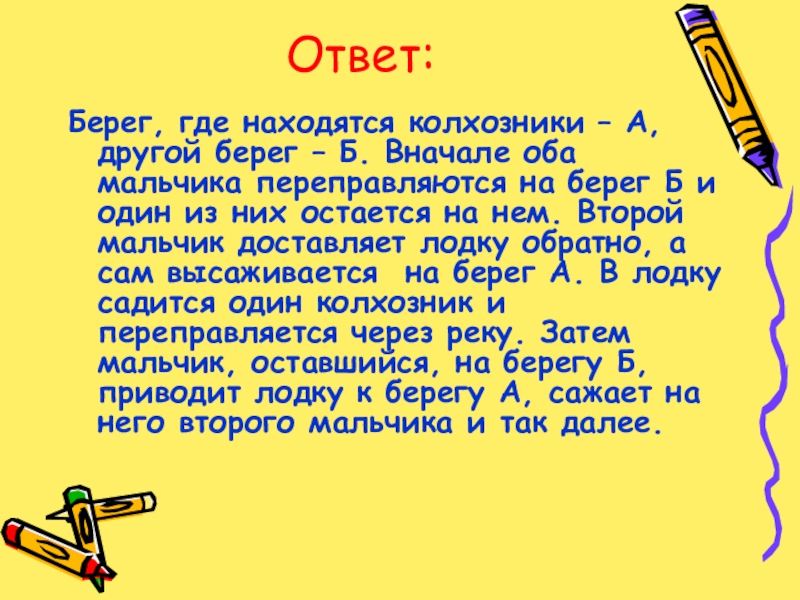 оба мальчика переправляются на берег Б и один из них остается на нем. Второй мальчик доставляет лодку обратно, а сам высаживается на берег А. В лодку садится один колхозник и переправляется через реку. Затем мальчик, оставшийся, на берегу Б, приводит лодку к берегу А, сажает на него второго мальчика и так далее.