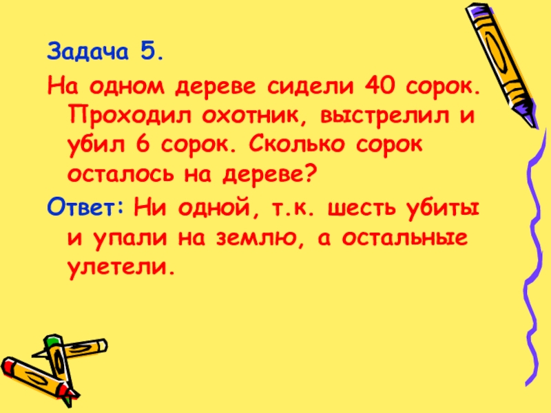 убил 6 сорок. Сколько сорок осталось на дереве?