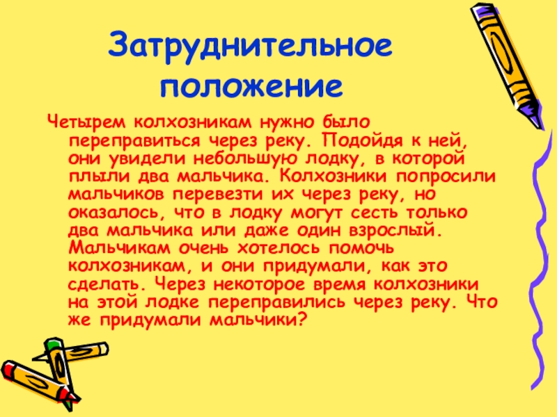 они увидели небольшую лодку, в которой плыли два мальчика. Колхозники попросили мальчиков перевезти их через реку, но оказалось, что в лодку могут сесть только два мальчика или даже один взрослый. Мальчикам очень хотелось помочь колхозникам, и они придумали, как это сделать. Через некоторое время колхозники на этой лодке переправились через реку. Что же придумали мальчики?