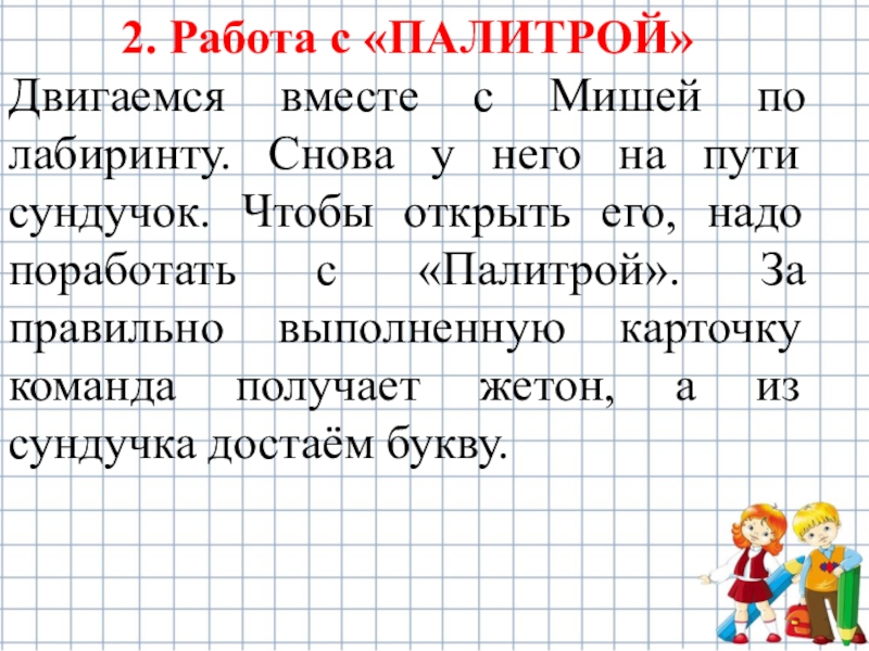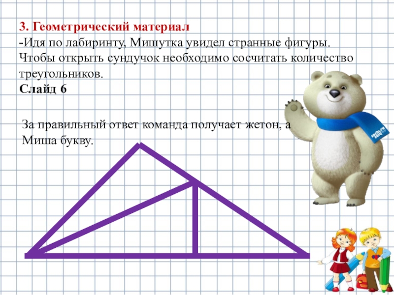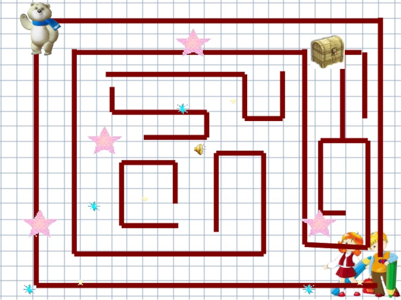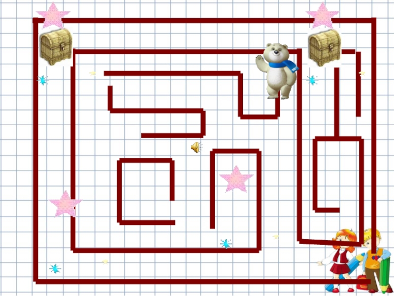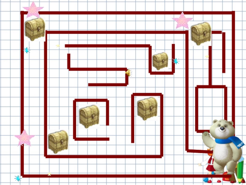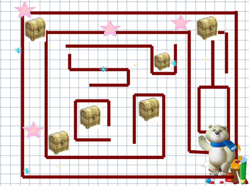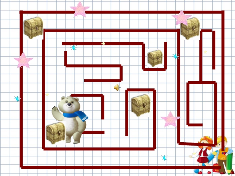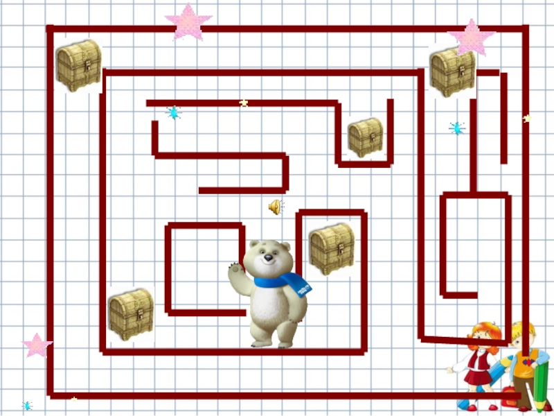 - Правильно, он был одним из символов олимпийских игр в Сочи. На слайде вы видите карту лабиринта. Нам необходимо добраться до сундучков и узнать, какую вещь, необходимую Мише, спрятал волшебник. За выполненные задания вы будете получать звёздочки.