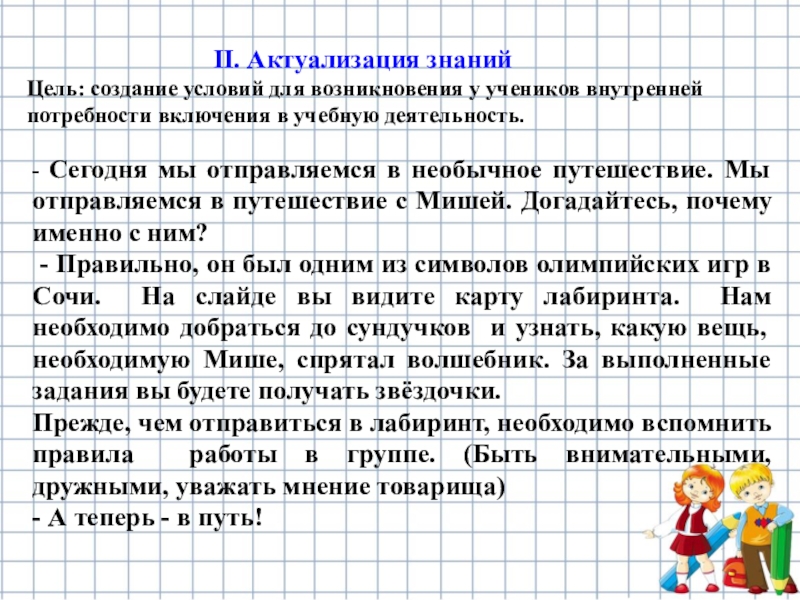 Прежде, чем отправиться в лабиринт, необходимо вспомнить правила работы в группе. (Быть внимательными, дружными, уважать мнение товарища)