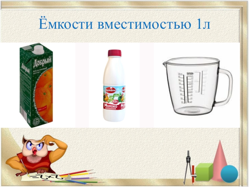 Тема урока: «Объём. Единицы измерения объёма.»Цели: узнаем что такое объём, как его измерить, каковы единицы измерения объёма.