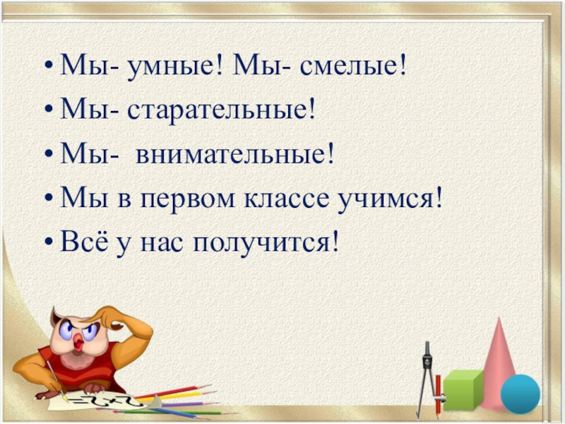 Мы- умные! Мы- смелые!Мы- старательные!Мы- внимательные!Мы в первом классе учимся!Всё у нас получится!