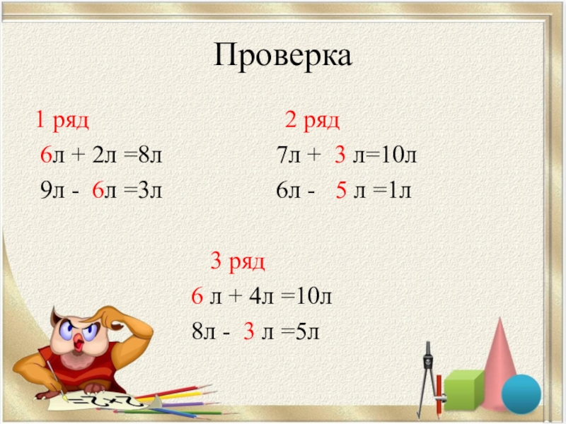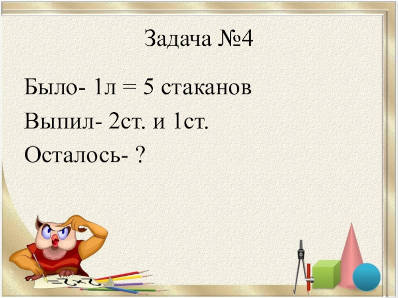 Задача №4Было- 1л = 5 стакановВыпил- 2ст. и 1ст.Осталось- ?