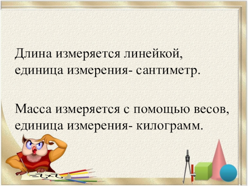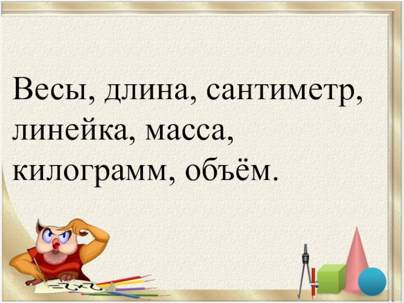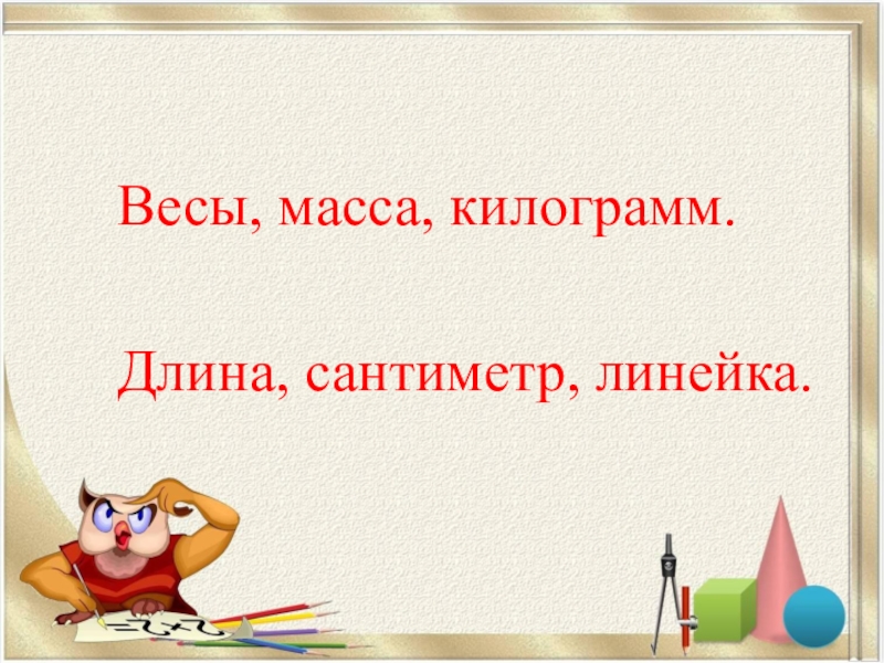 Весы, масса, килограмм.Длина, сантиметр, линейка.