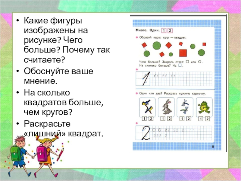 Какие фигуры изображены на рисунке? Чего больше? Почему так считаете?Обоснуйте ваше мнение.На сколько квадратов больше, чем кругов?Раскрасьте