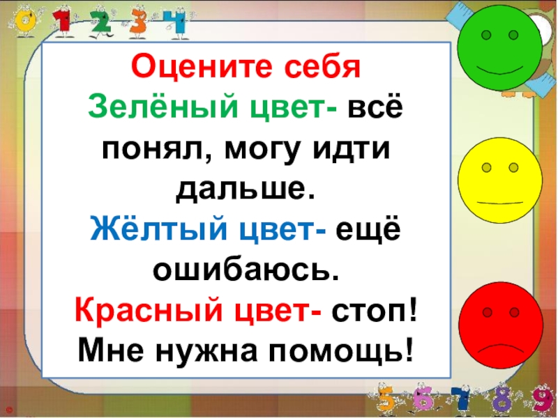 Оцените себяЗелёный цвет- всё понял, могу идти дальше.Жёлтый цвет- ещё ошибаюсь.Красный цвет- стоп! Мне нужна помощь!