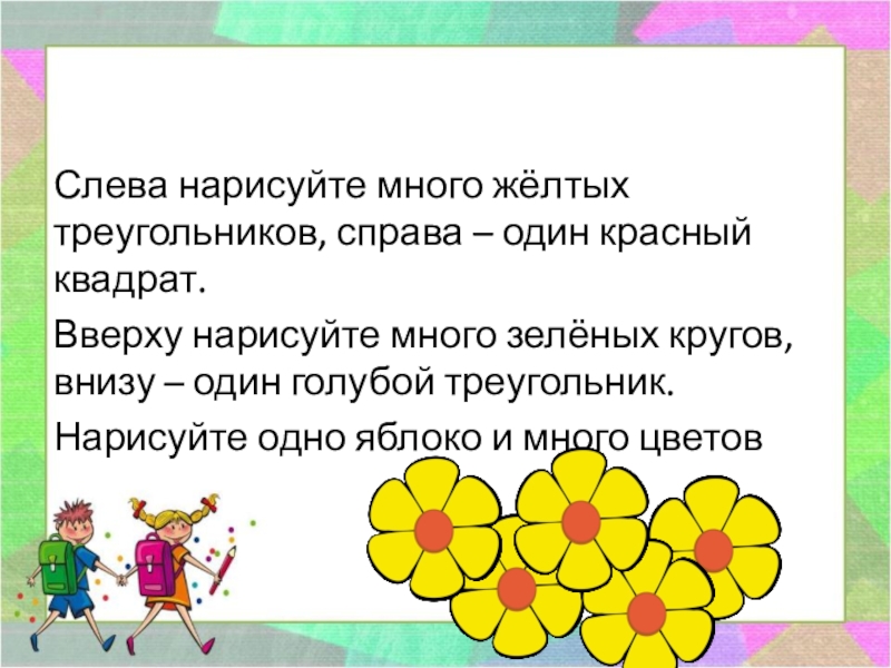Слева нарисуйте много жёлтых треугольников, справа – один красный квадрат.Вверху нарисуйте много зелёных кругов, внизу – один