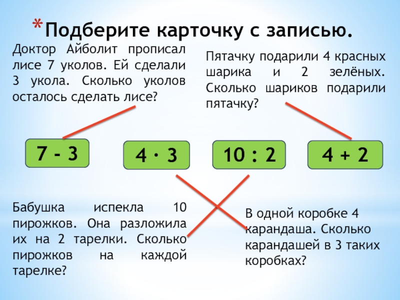Бабушка испекла 10 пирожков. Она разложила их на 2 тарелки. Сколько пирожков на каждой тарелке?