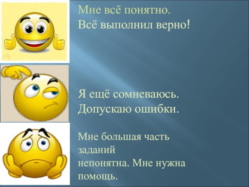 Мне всё понятно. Всё выполнил верно!Я ещё сомневаюсь. Допускаю ошибки.Мне большая часть заданийнепонятна. Мне нужна помощь.