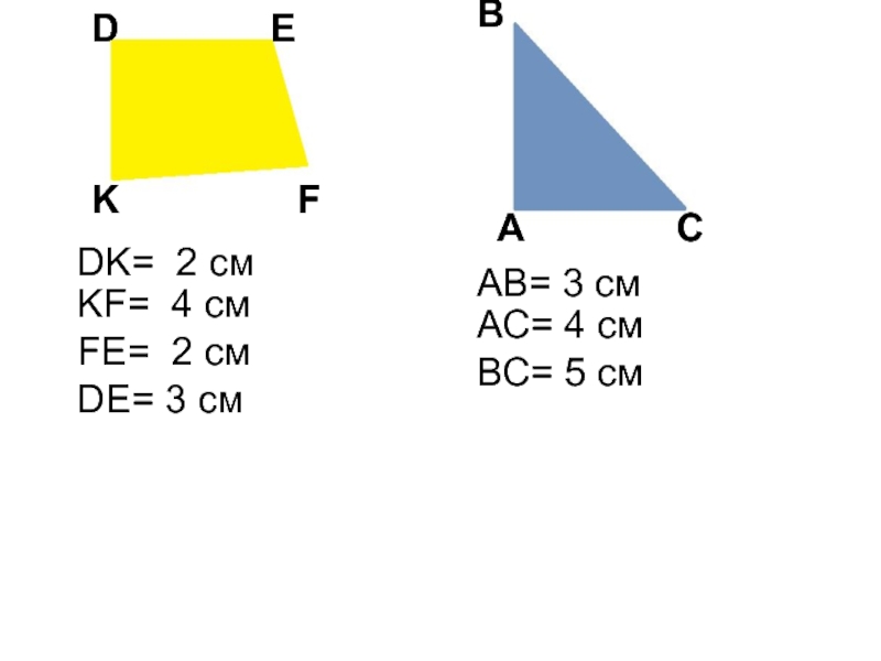 DKEFABC DK= 2 смKF= 4 смFE= 2 смDE= 3 смAB= 3 смAC= 4 смBC= 5 см
