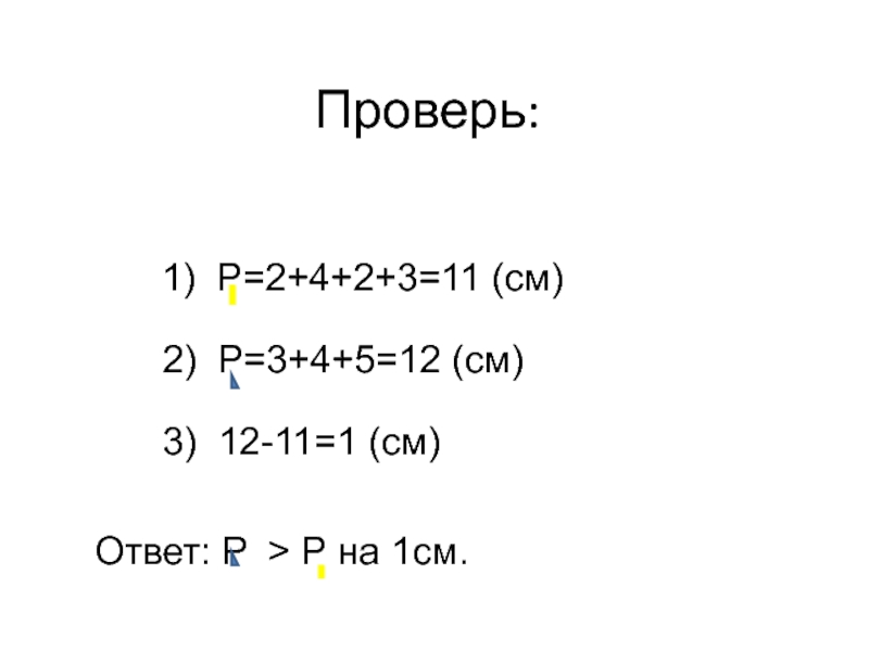 Проверь:1) P=2+4+2+3=11 (см)2) P=3+4+5=12 (см)3) 12-11=1 (см)Ответ: P > P на 1см.