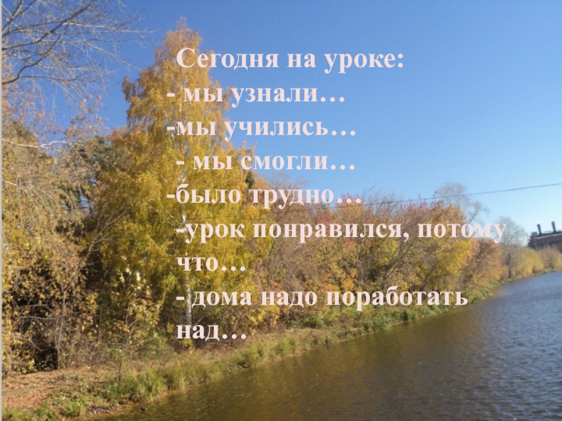 Сегодня на уроке: мы узнали…мы учились…- мы смогли…было трудно…-урок понравился, потому что…- дома надо поработать над…