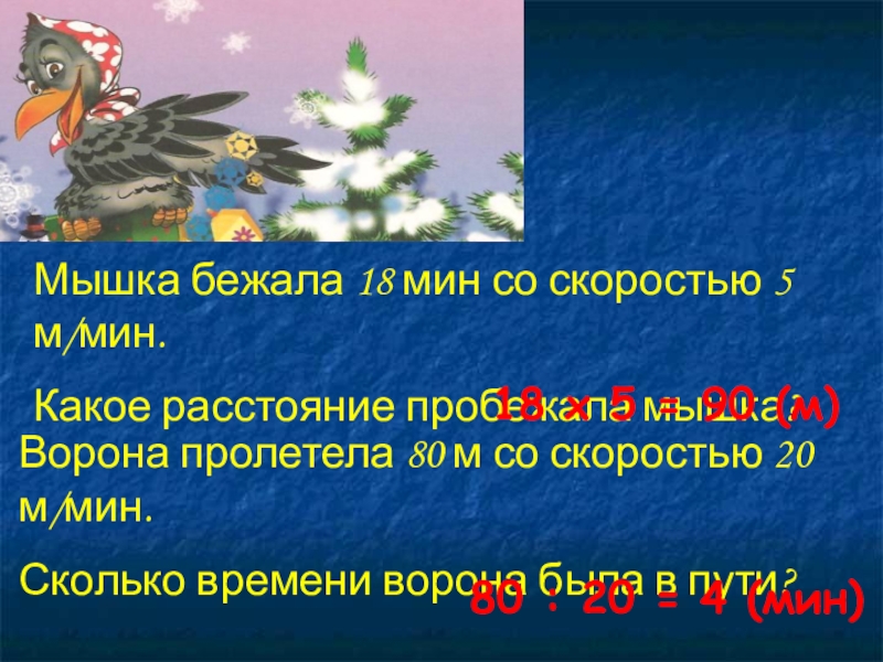 Ворона пролетела 80 м со скоростью 20 м/мин.
