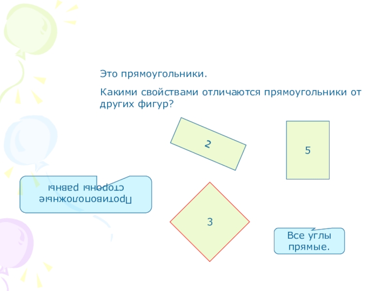253Это прямоугольники. Какими свойствами отличаются прямоугольники от других фигур?Противоположные стороны равныВсе углы прямые.