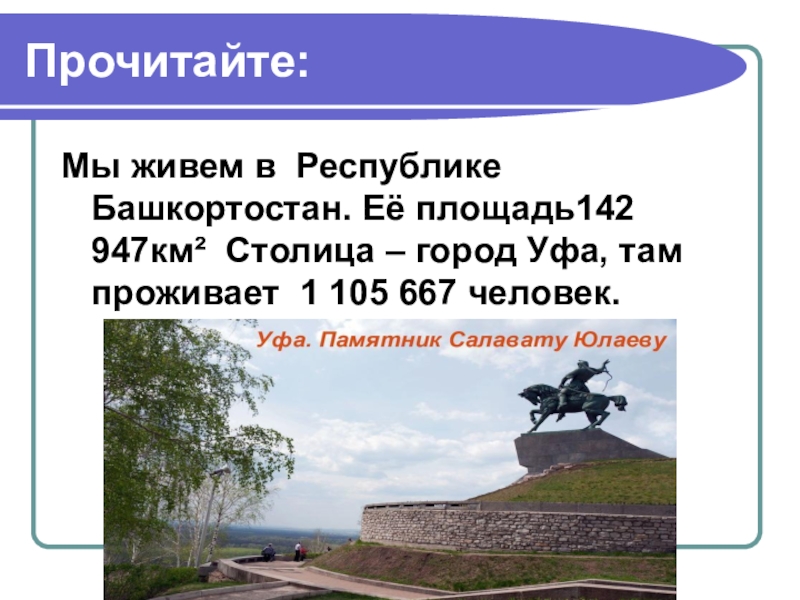 Прочитайте:Мы живем в Республике Башкортостан. Её площадь142 947км² Столица – город Уфа, там проживает 1 105 667 человек.