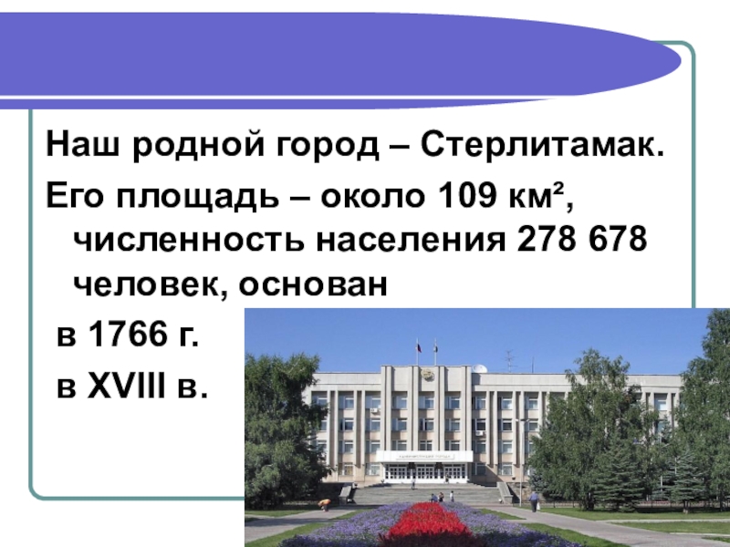 Наш родной город – Стерлитамак.Его площадь – около 109 км², численность населения 278 678 человек, основан в 1766