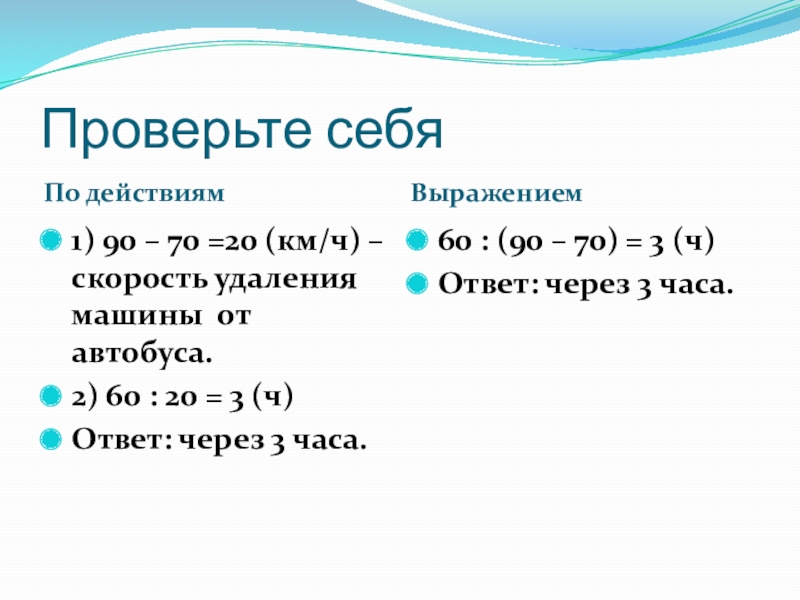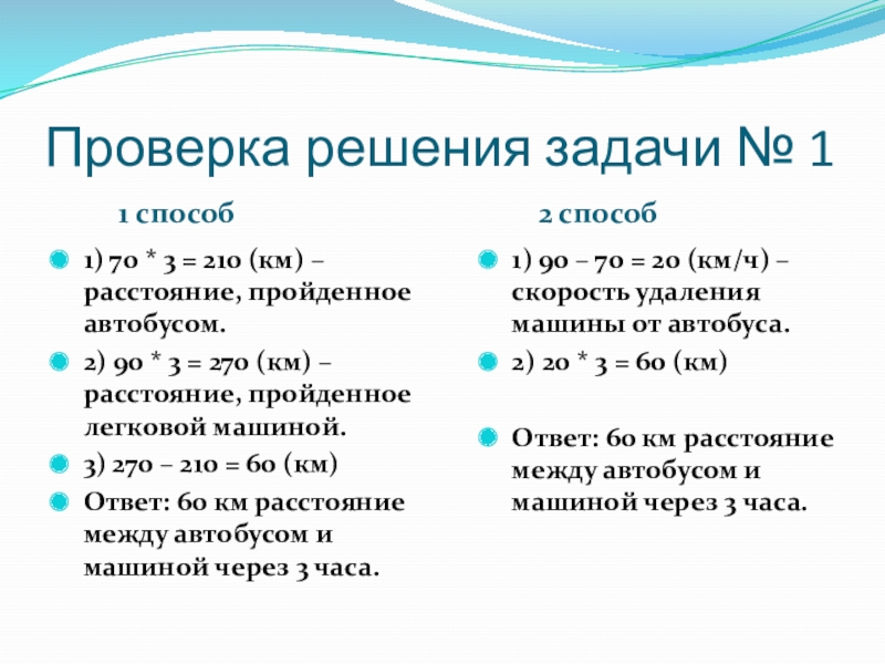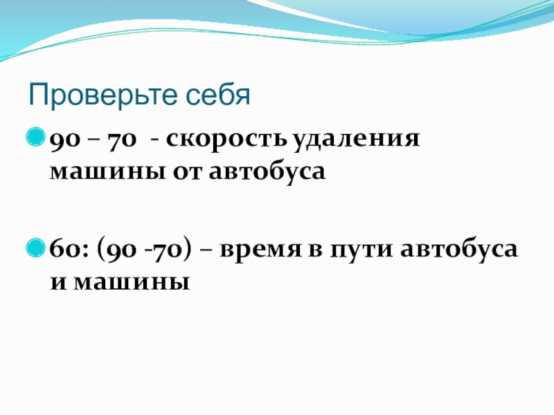 1) 90 – 70 = 20 (км/ч) – скорость удаления машины от автобуса.