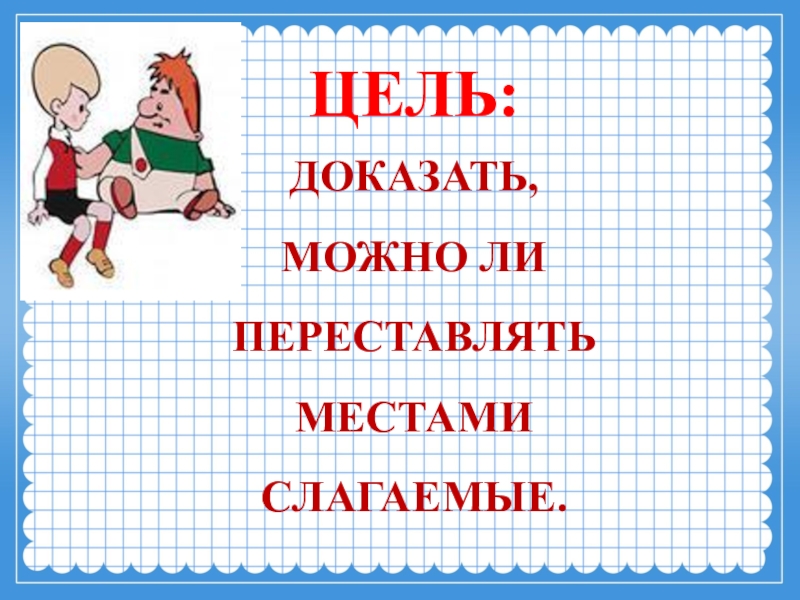 ЦЕЛЬ: ДОКАЗАТЬ, МОЖНО ЛИ ПЕРЕСТАВЛЯТЬ  МЕСТАМИ СЛАГАЕМЫЕ.