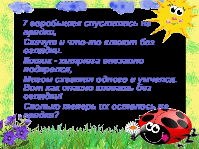 7 воробышек спустились на грядки,  Скачут и что-то клюют без оглядки.  Котик -
