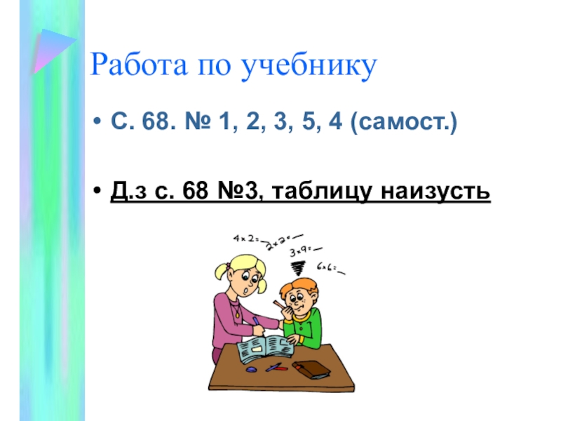 Работа по учебникуС. 68. № 1, 2, 3, 5, 4 (самост.)Д.з с. 68 №3, таблицу наизусть
