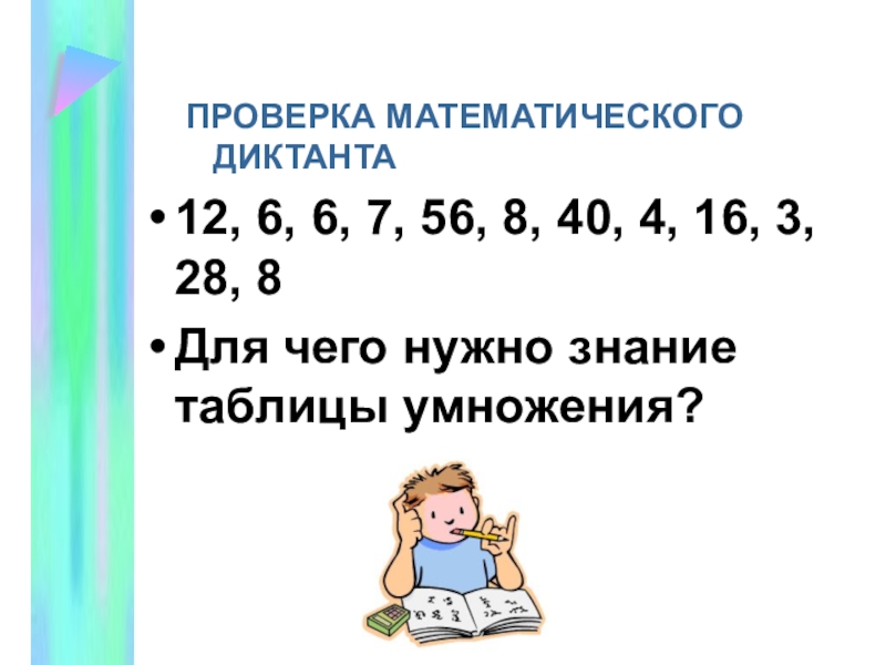 ПРОВЕРКА МАТЕМАТИЧЕСКОГО ДИКТАНТА12, 6, 6, 7, 56, 8, 40, 4, 16, 3, 28, 8Для чего нужно знание